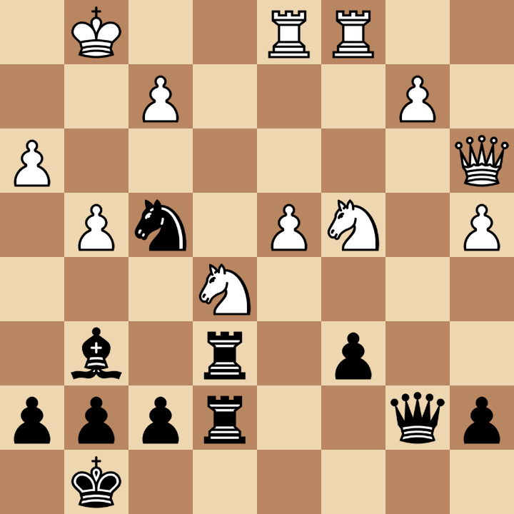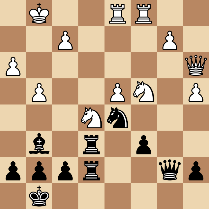 We reached this position on move 27. I can’t remember exactly how much time had passed, but it was at least 90 minutes total. Once we got here, I knew that we were at a crucial juncture in the game, and I suspected that we were just about even — an evaluation that the engine later confirmed for me.2 That’s pretty good, considering how much higher-rated my opponent was. I knew I had a chance to either draw or win, though it would be an uphill battle still.