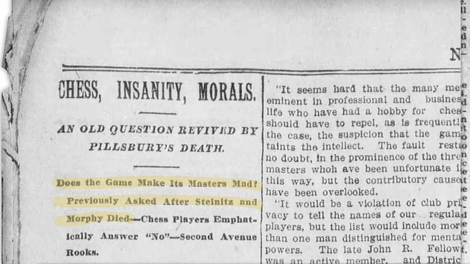 There’s this stereotype that chess drives people insane. There is some truth to that. That’s why it’s worth doing, just like rock climbing or Brazilian jiu jitsu or ultramarathons (or, for that matter, studying quantum mechanics or being a parent or writing a novel) are worth doing. They push you. They force you to improve. They’re hard, and they have risks.